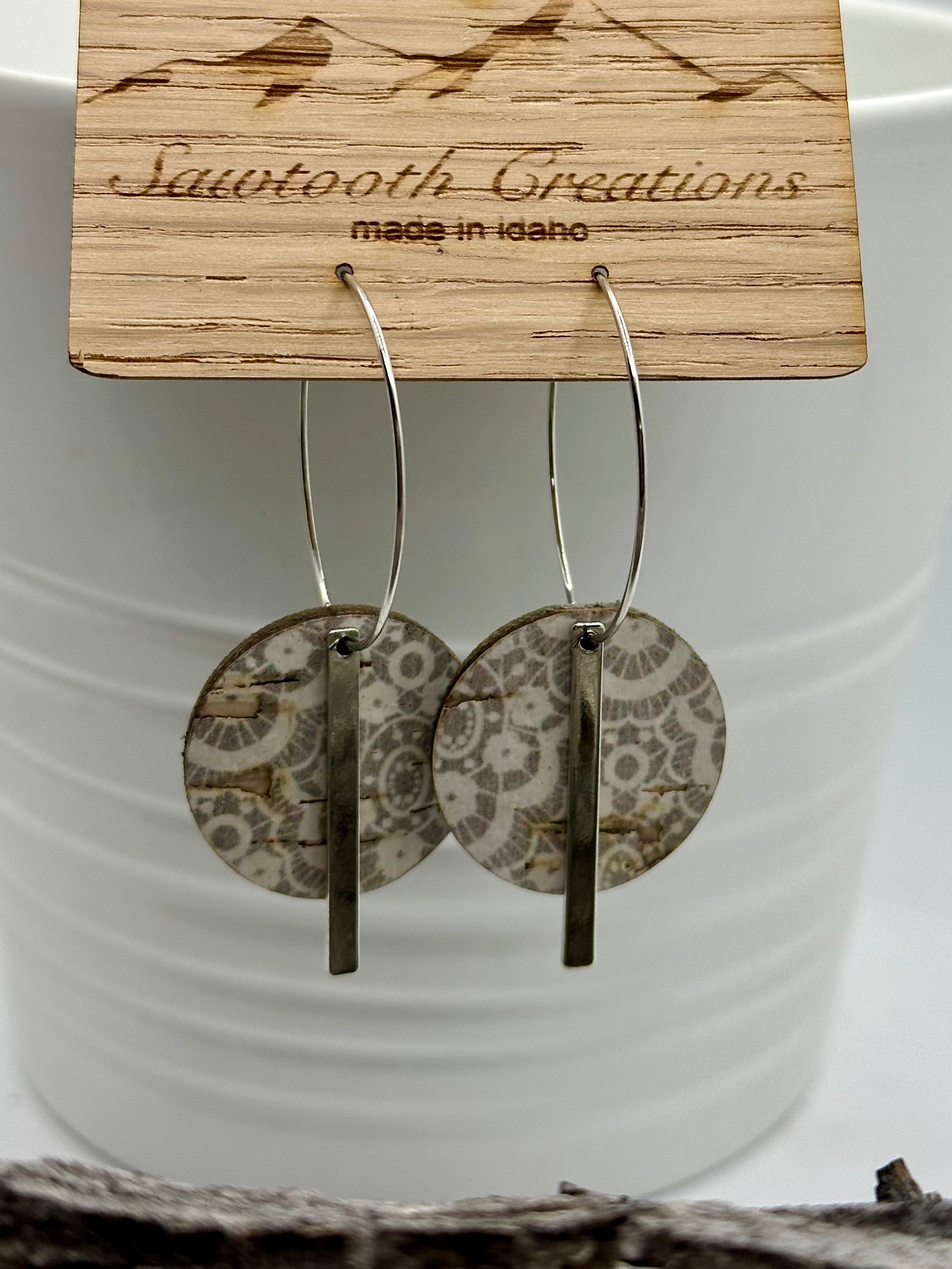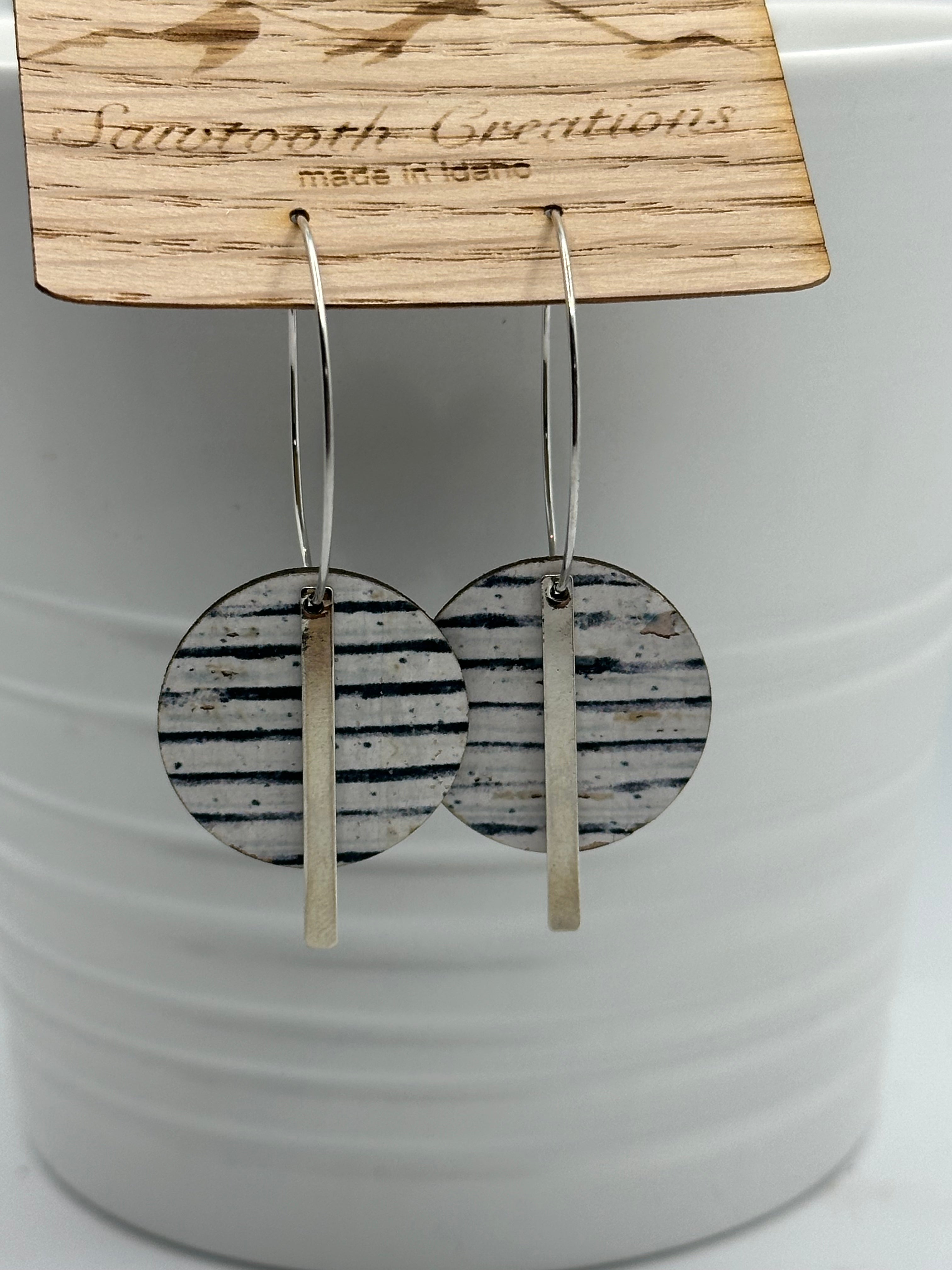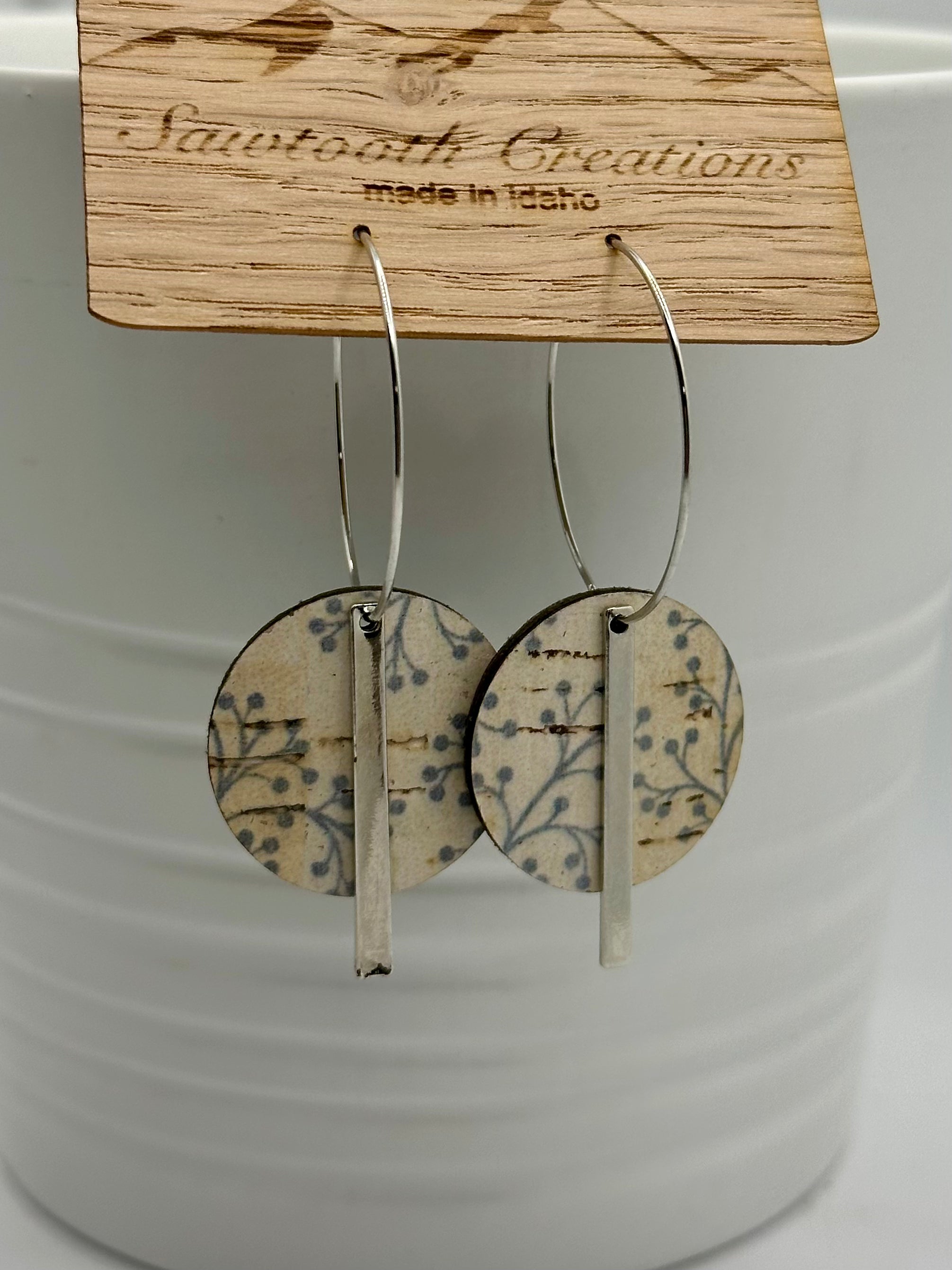 Lightweight earrings with cork/leather circle and silver metal bar