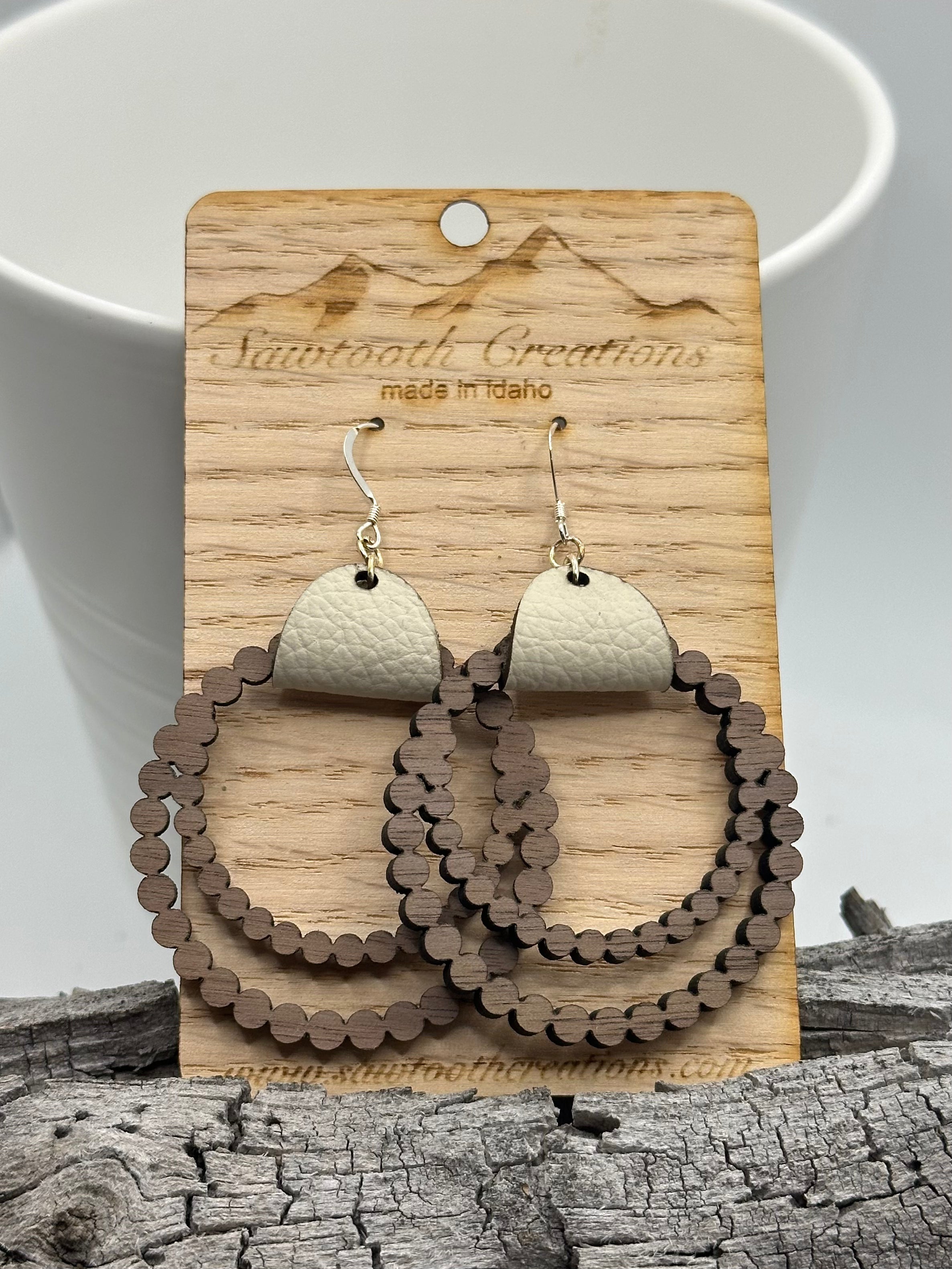 These wooden and leather earrings are very lightweight and a great statement piece for your outfit. They are approximately 2.6 in length including hooks.